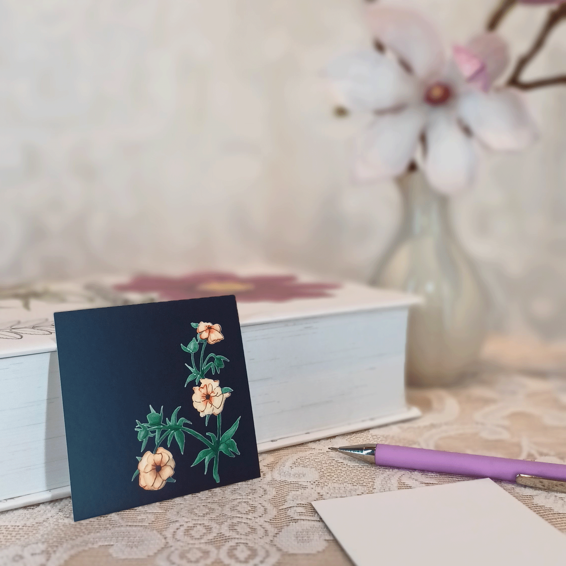 Litet, färgsprakande kort med söta detaljer från flora och fauna. Perfekt tillskott till en omtänksam present eller en härlig blombukett.