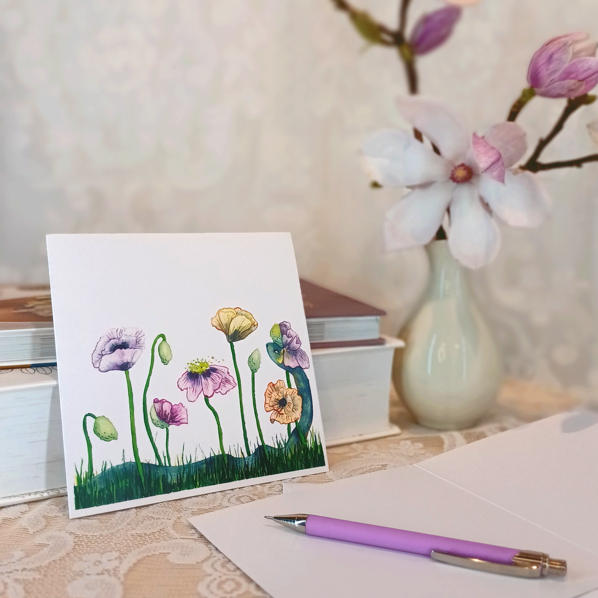 Stort deluxekort med färgsprakande, uttrycksfulla detaljer från flora och fauna. Perfekt tillskott till en omtänksam present eller en härlig blombukett.