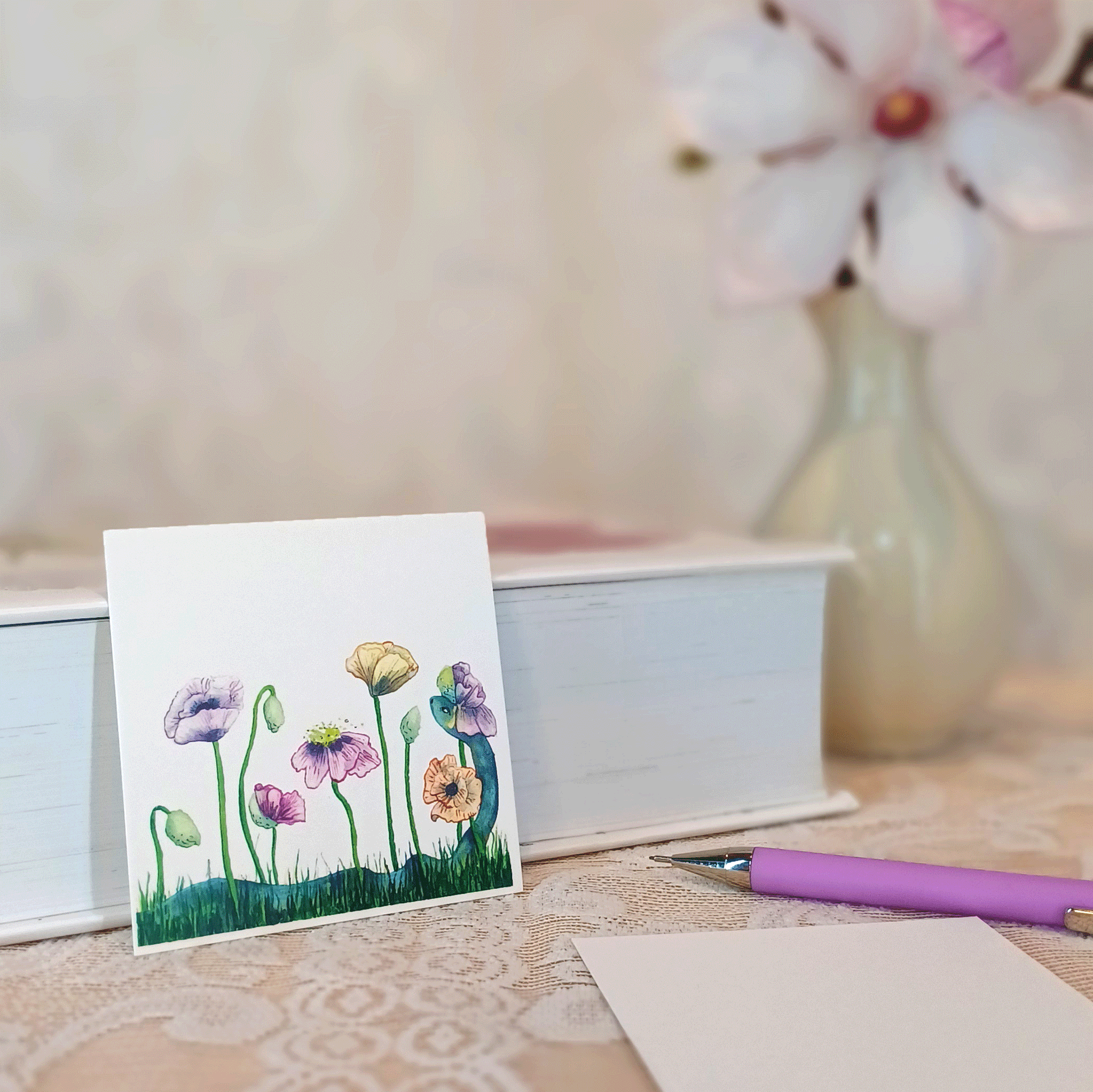Litet, färgsprakande kort med söta detaljer från flora och fauna. Perfekt tillskott till en omtänksam present eller en härlig blombukett.
